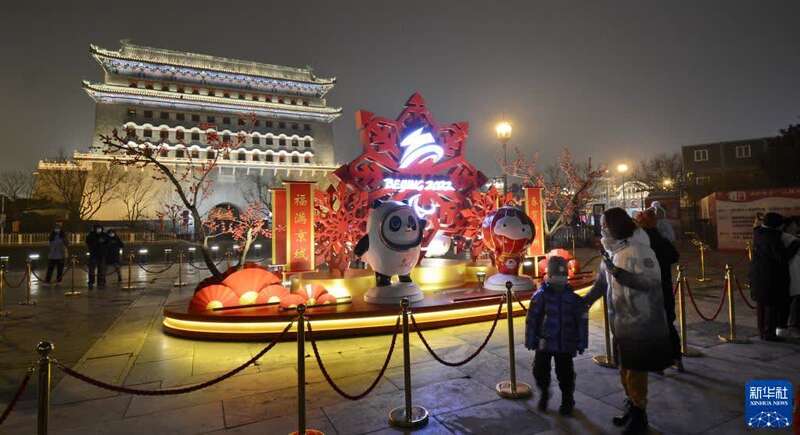 1月30日,市民在前门大街观赏春节和冬奥主题景观灯。
