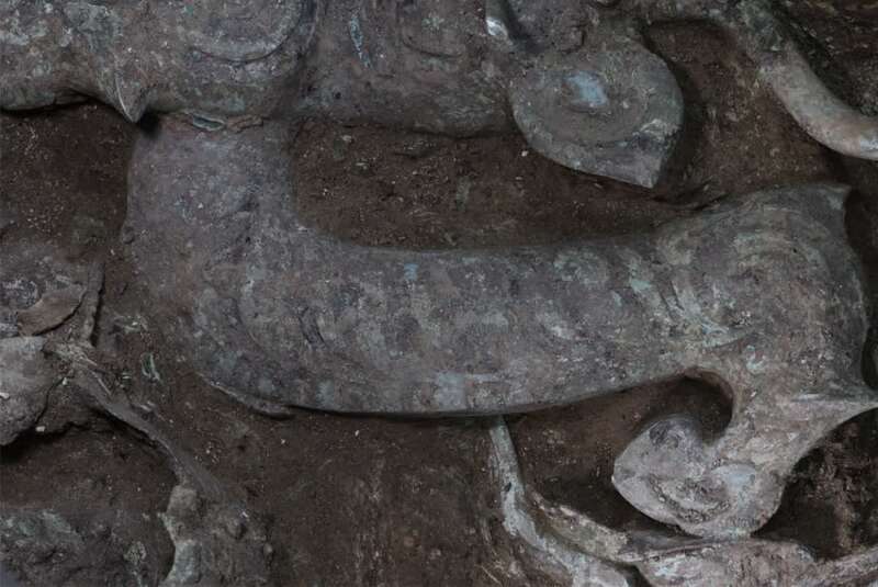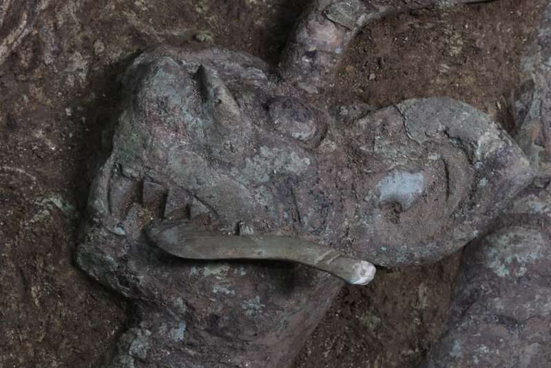 赵昊告诉记者,这件虎头龙身青铜像的前肢立在一个三角形的铜支架上,后身翘起,后肢跟另一件焊在一起,嘴里衔着一个带刃的东西。前段还立有一只鸟,鸟身表面的阴线里是有朱砂填彩的,最有趣的是虎头龙身青铜像的眼睛正中用黑彩(材料尚未检测)点了一个非常圆的眼珠,堪称画龙点睛。目前看到的文物基座横宽55厘米、高85厘米,还有一部分还在土里,整体的样貌非常值得期待。