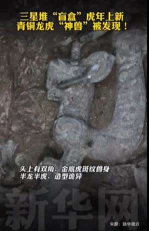 前段时间,8号祭祀坑发现一只虎头虎脑的青铜龙虎“神兽”。这个“神兽”头上有双角、金底虎斑纹兽身、半龙半虎。
