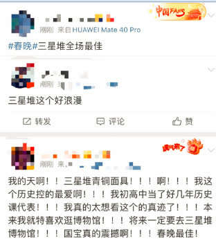 有网友表示,神秘三星堆出土必是精品,让人“脑洞大开”,刷新认知。有人也说,看到这些文物,感觉又感动又有未来感,“历史铭刻被掩埋的记忆,我们在千年后回望你”。