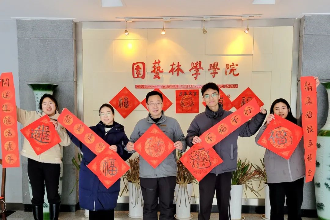 园艺林学学院延续传统,为近200名寒假留校师生开展了“园林留·年”系列文化活动,品味不一样的年味,以“文化-融乐-温度”迎接壬寅虎年。辞旧迎新茶话会在耕读茶室举行,同学们围桌而坐,讲述自己的故事,畅谈对学术科研的期许,尽管室外下着雨,但茶室充满着暖意。2019级农艺与种业专业茶学方向研究生晏智讲述了自己在华农近七年的读书成长历程,毕业后即将从事高校辅导员工作的他也从茶学谈到了耕读精神,他说:“每年变化的是年份,不变的是学校关心学生的暖心和初心。”春联书福活动中,2021级蔬菜学研究生袁良丹在创作的对联上,不忘画上几颗“科研味儿”的番茄,饱含着自己对于虎年学业的期盼。2021级风景园林学研究生唐与岑将写下的“平安喜乐”送给在场的孔秋生老师。