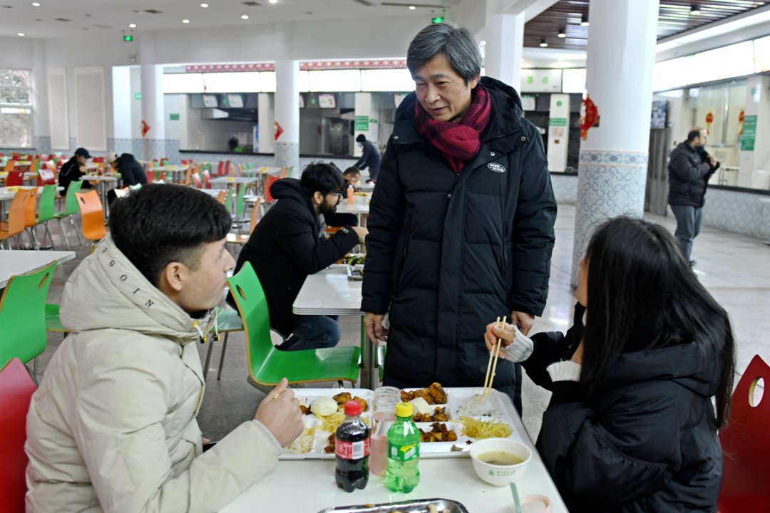 ▲高翅在橘园食堂看望少数民族留校学生和留学生(吴晗 摄)