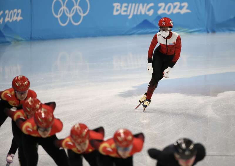 2月2日,中国香港选手朱定文(右上)进行短道速滑训练。中国日报记者 张威 摄