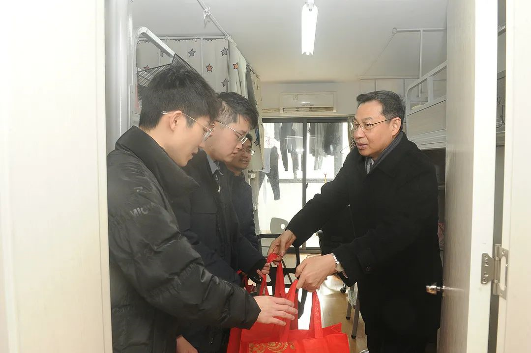 不少医学院研究生肩负科研学习和在医院临床实习的双重任务,选择了留宁过节。王振林一行来到南园陶一的医学院研究生宿舍,亲切慰问春节期间因实习值班无法回家的同学。勉励大家继续努力,积淀深厚的理论基础和专业知识,发扬勇于担当、甘于奉献的精神,以医者之仁心,履社会之责任,担时代之使命。