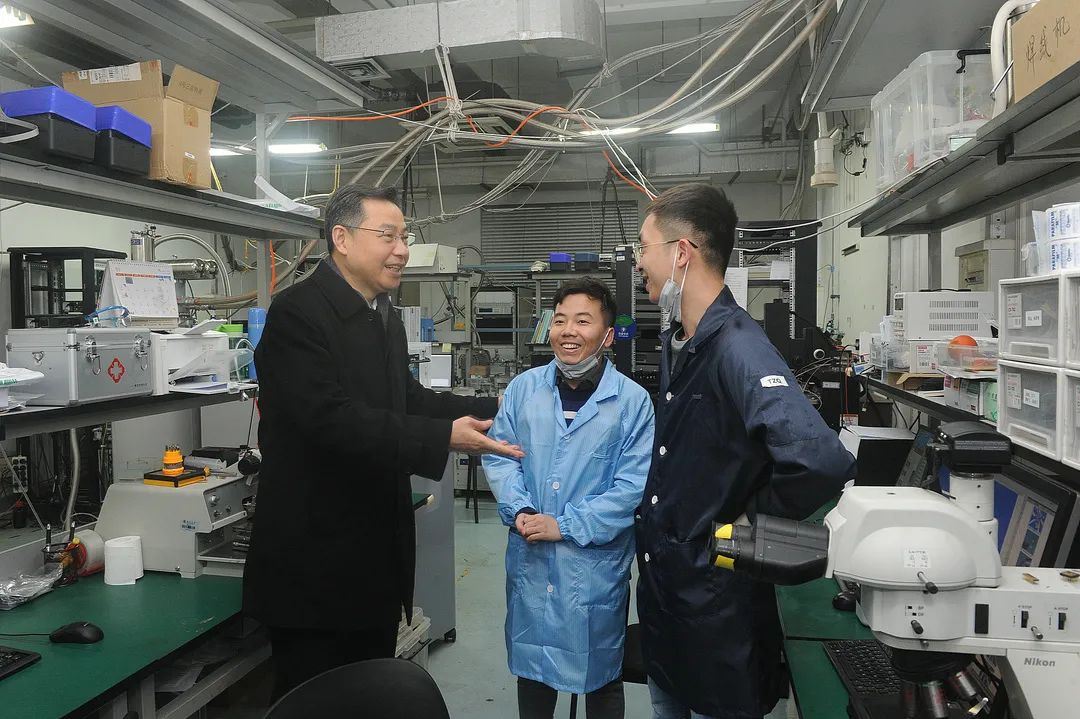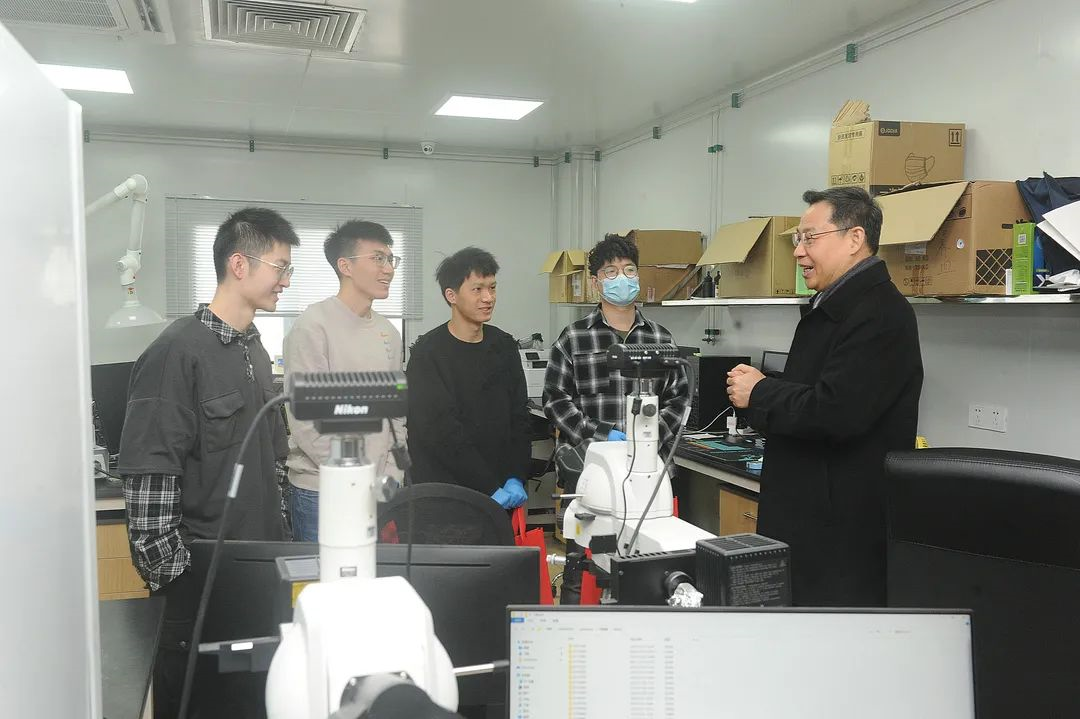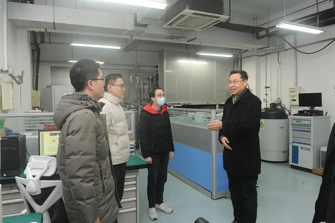随后,王振林一行来到鼓楼校区唐仲英楼物理学院实验室,当了解到同学们留校过春节大都出于科研实验需要,他勉励同学们珍惜在校时光,度过一个充实而有意义的假期,多与导师交流,拓展前沿视野,潜心学术科研,啃得“硬骨头”,下得“苦功夫”。王振林特别提到假期依然心念实验室工作的邢定钰院士,并寄语新时代的南大学子以老一辈科学家为榜样,传承百廿南大精神,为推动科技自立 自强做出卓越贡献。