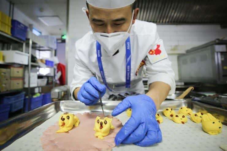 图为五棵松体育中心员工餐厅的厨师正在为外籍工作人员制作中国传统的“老虎花馍”,寓意着新的一年吉祥如意,也寄托着对美好生活的祝愿与向往。(五棵松体育中心:范杰 摄影:樊迪)