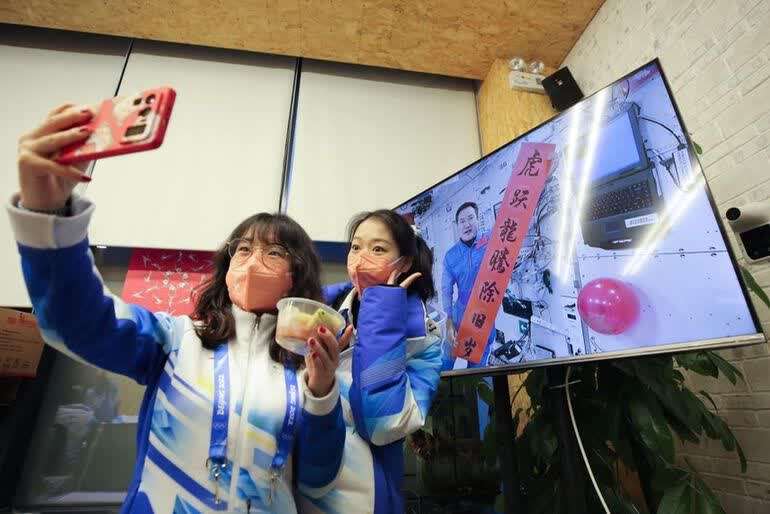 图为拿到饺子的志愿者们跟正好出现在电视中的宇航员翟志刚合影留影。(五棵松体育中心:范杰 摄影:樊迪)