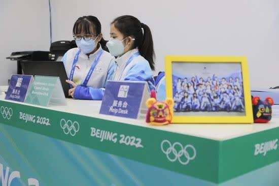 图为五棵松体育中心记者工作区内志愿者们正在做前期准备工作,迎接到馆的国内外记者。(五棵松体育中心:范杰 摄影:樊迪)