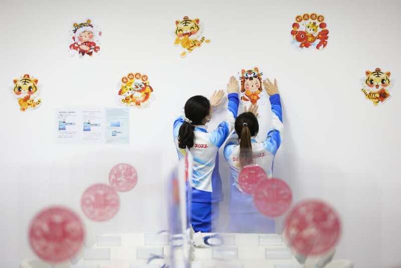图为五棵松体育中心新闻运行志愿者在记者工作区布置春节元素,为前来工作的记者们打造温馨氛围。(五棵松体育中心:范杰 摄影:樊迪)