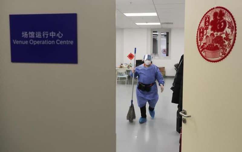 图为1月31日早8点,五棵松体育中心早班上岗的清废人员正在对工作间进行清洁。(五棵松体育中心:范杰 摄影:樊迪)