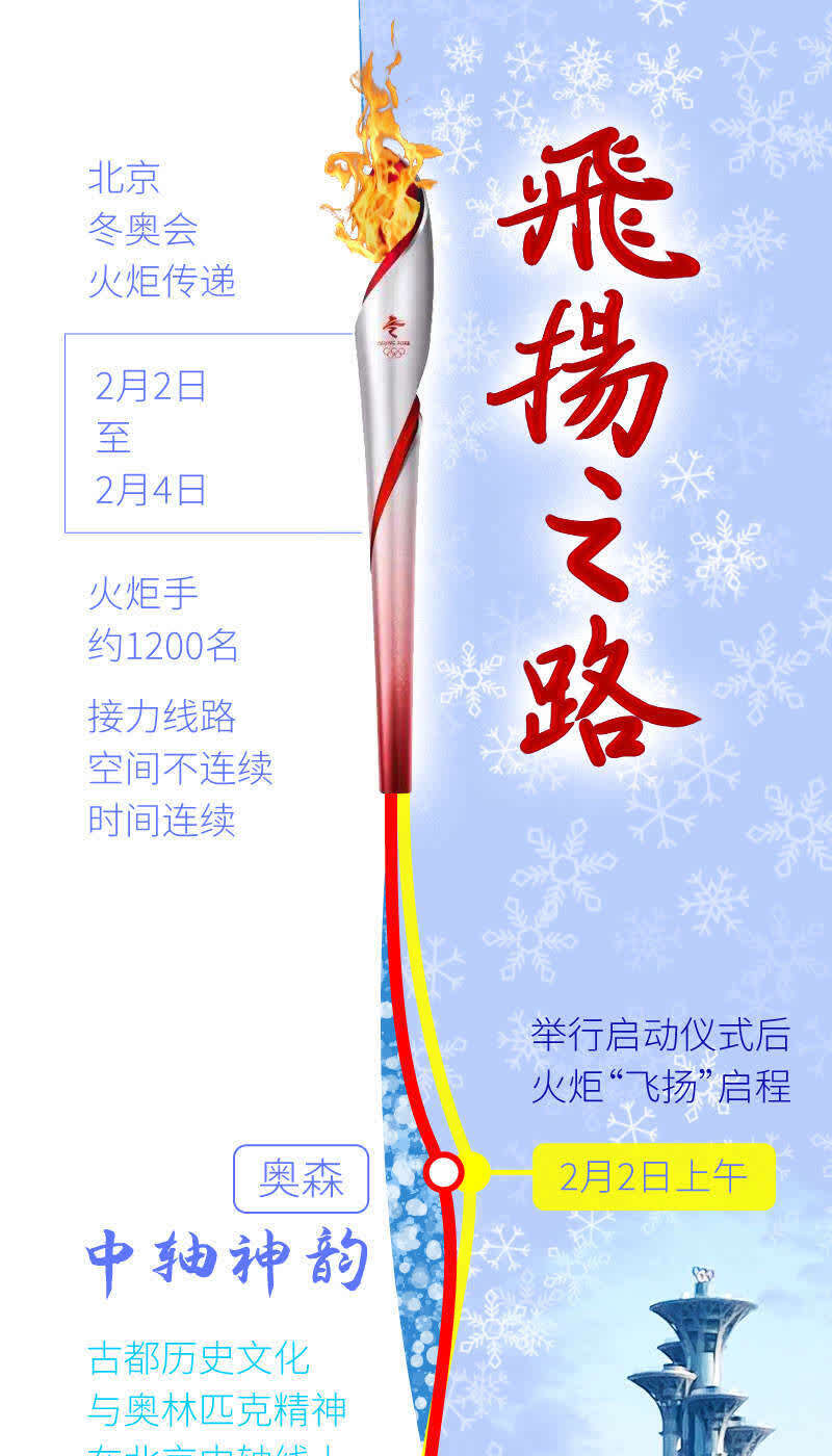 北京冬奥火炬接力2月2日至4日在北京、延庆、张家口三个赛区进行,约1200名火炬手高举“飞扬”传递圣火。这条“飞扬之路”,弘扬了奥林匹克精神,展现着中华民族风采。