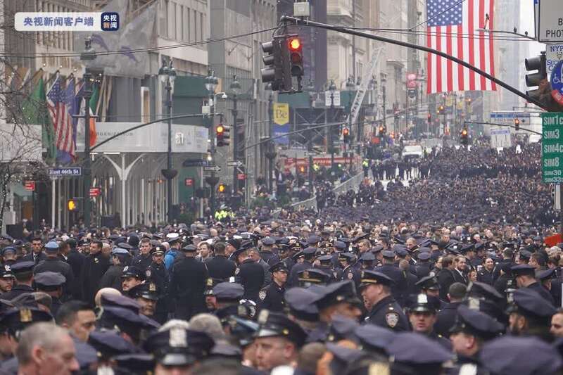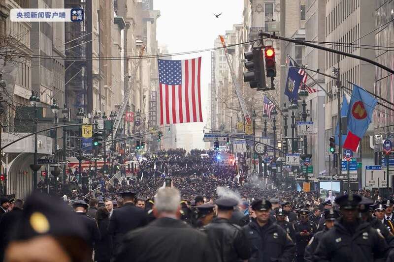 当地时间2月2日,美国纽约市举行第二场在职警察遭伏击死亡葬礼,上万纽约警察前往现场送别同事。