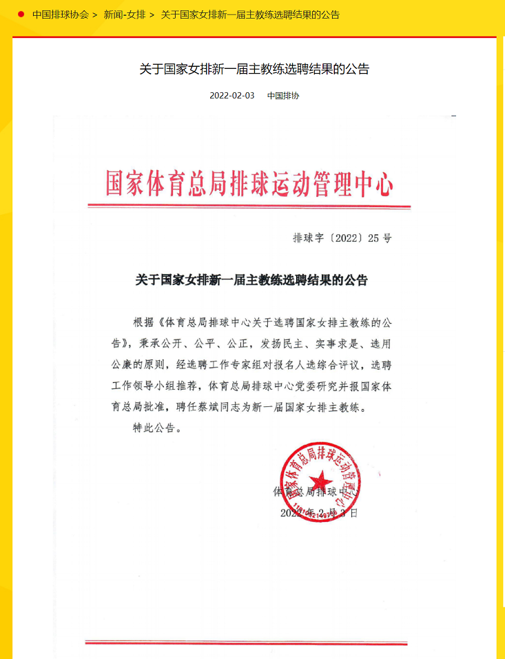 中国青年报客户端北京2月3日电(中青报·中青网记者慈鑫)中国排球协会今天下午发布公告,宣布蔡斌当选新一届中国女排主教练。蔡斌曾在2009年3月至2010年3月担任过中国女排主教练。