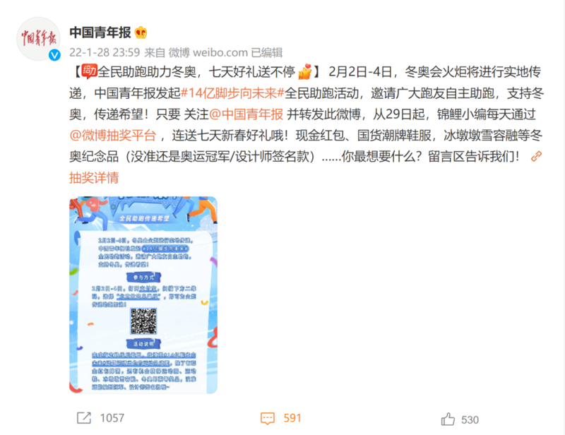 2月2日-4日,冬奥会火炬进行实地传递。中国青年报社发起“14亿脚步向未来”全民助跑活动,邀请广大跑友自主助跑,支持冬奥,传递希望。1月29日起,连送七天新春好礼。