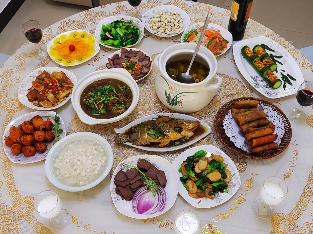 旧岁此夕尽,新春今日回。除夕佳节,煎炒烹炸将旧岁的酸甜苦辣融会成一道道承载着新年希望的除夕佳肴。随着一年的思念与记忆注入其中,一桌简简单单的饭菜变成了最能抚慰游子心灵的年夜饭。天南海北,年夜饭的菜式或许天差地别,但都有着同样熟悉温暖的味道。这熟悉的味道,会在人们的欢声笑语中,从旧岁飘向新年。