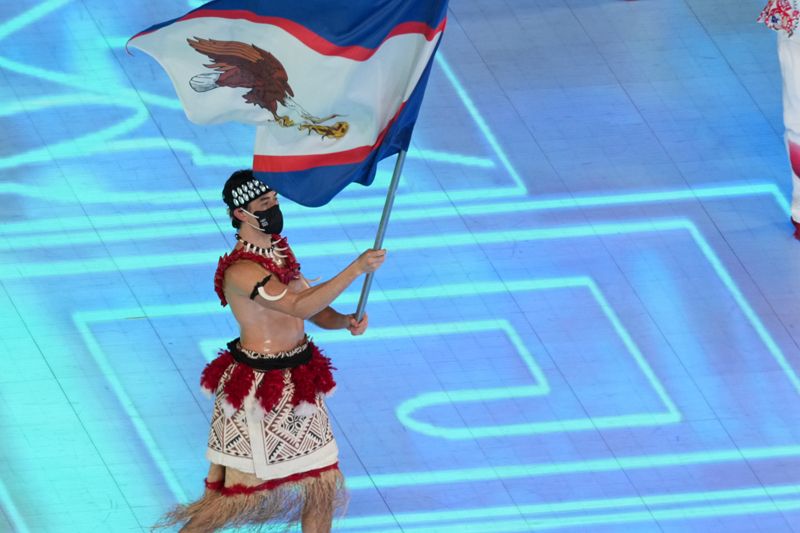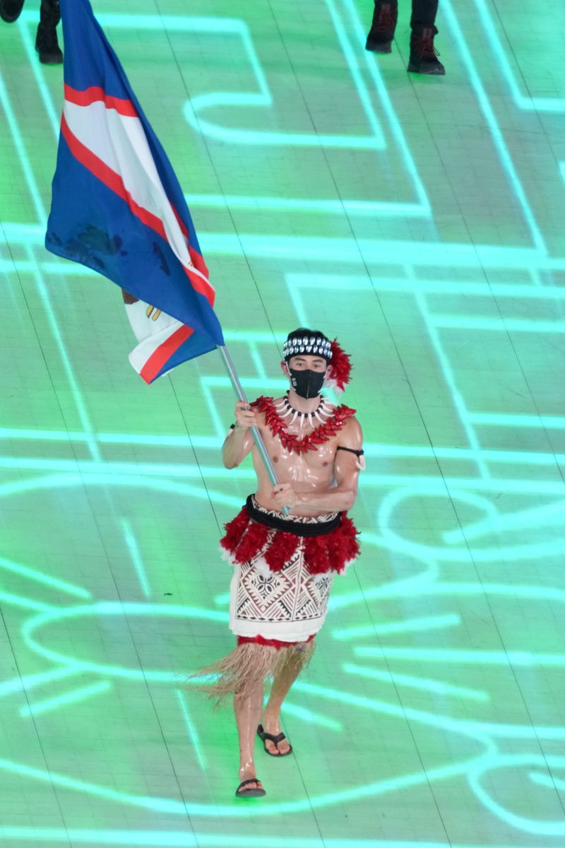 美属萨摩亚旗手赤裸上身“清凉”出场,一些现场观众和网友问:这位旗手不冷吗?(记者耿学清 李隽辉)