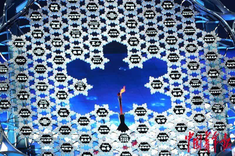 奥运点火仪式举行,出人意料,火炬手手中的火炬就是主火炬,这是最小的主火炬了,它搭乘一朵雪花,升起在鸟巢中央,体现了环保低碳理念。