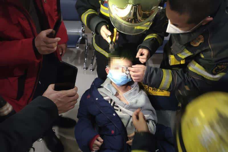 23时55分救援人员到达现场,消防员发现孩子左眼皮卡在上衣拉链中。
