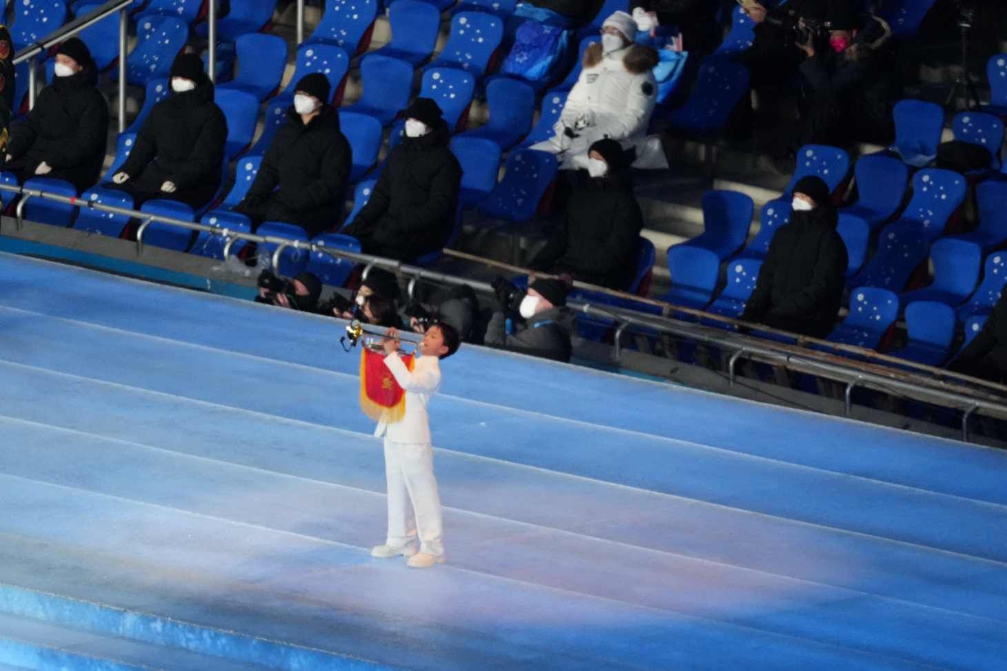 此时此刻,在一个年幼的小号手吹奏的《我和我的祖国》乐曲里,鸟巢里在举行中国国旗的传递。观众情不自禁哼唱。(张国 李隽辉)