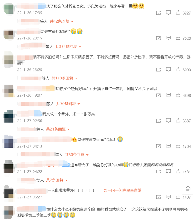 现如今,《一闪一闪亮星星》的官博下能看到相当多的观众还沉浸在剧情中无法自拔,呼唤着官方“快出第二季”、"开发点周边文创“,这个余韵悠长的故事或许有朝一日真能出一个番外,弥补结局的遗憾也未可知。
