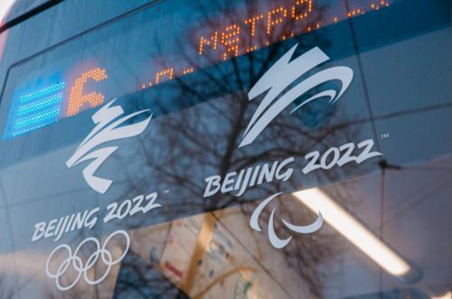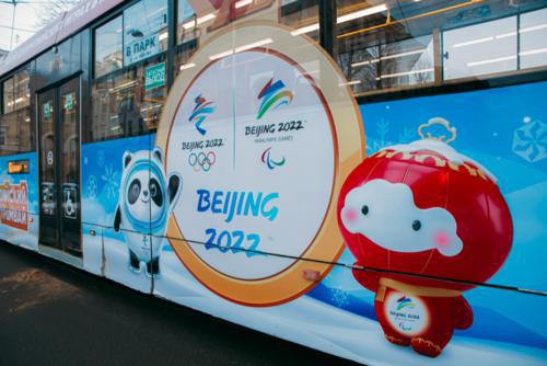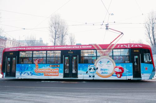“奥运电车”上北京冬奥会和冬残奥会标志。(图源:圣彼得堡市电气交通运输综合体)