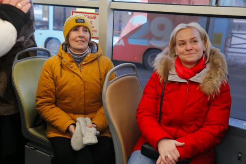 乘坐“奥运电车”的彼得堡市市民脸上露出喜悦的笑容。(图源:圣彼得堡市电气交通运输综合体)