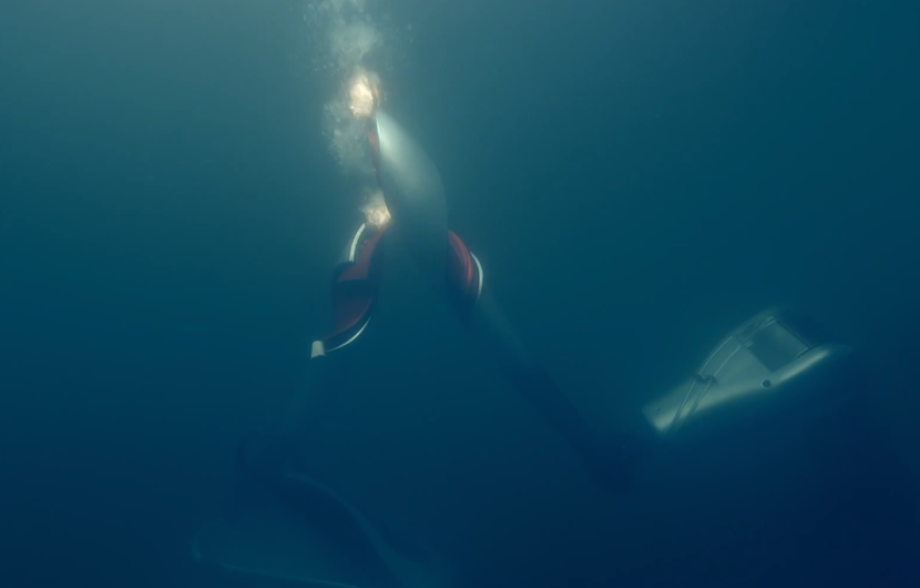 水下传递环节共包括机器人冰面滑行入水、水下火炬交接传火、机器人出水三个部分。首先出场的是水陆两栖机器人,形态与图饰色彩持重而灵动,从外观上看,它颇似一颗滴溜溜转的冰壶。冬奥火炬被设置在它的把手位置,好像正在被高高举起。手持燃烧着的火炬,水陆两栖机器人沿冰壶赛道旋转滑入冰洞口,在水下呈现出“水火交融”的神奇景象。