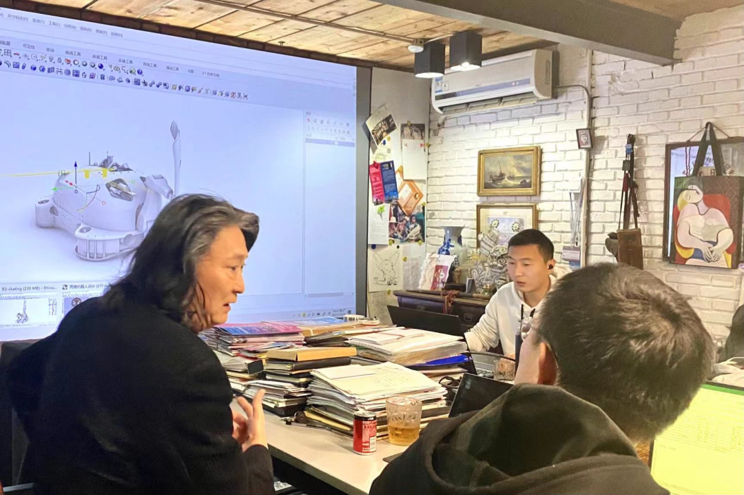 薛义教授(左一)与“智形”设计团队讨论工作