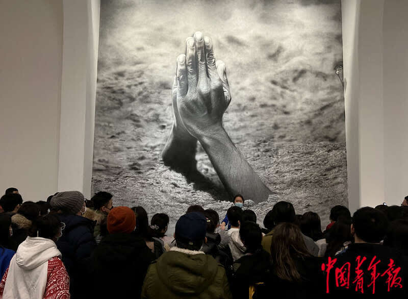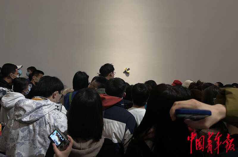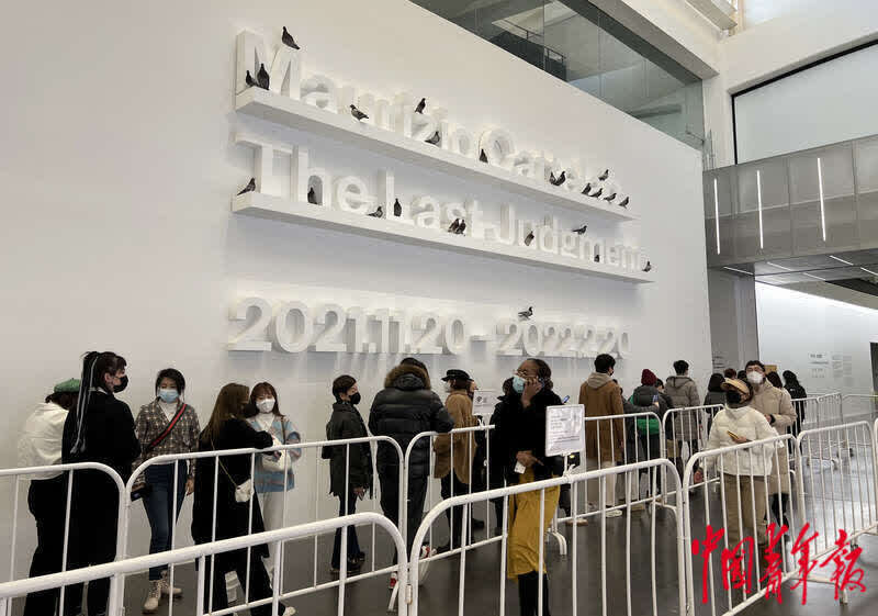 2月5日,北京798艺术区,尤伦斯当代艺术中心,“莫瑞吉奥·卡特兰:最后的审判”展览入口处,参观者们依次排队等候入场。中青报·中青网记者 程璨/摄