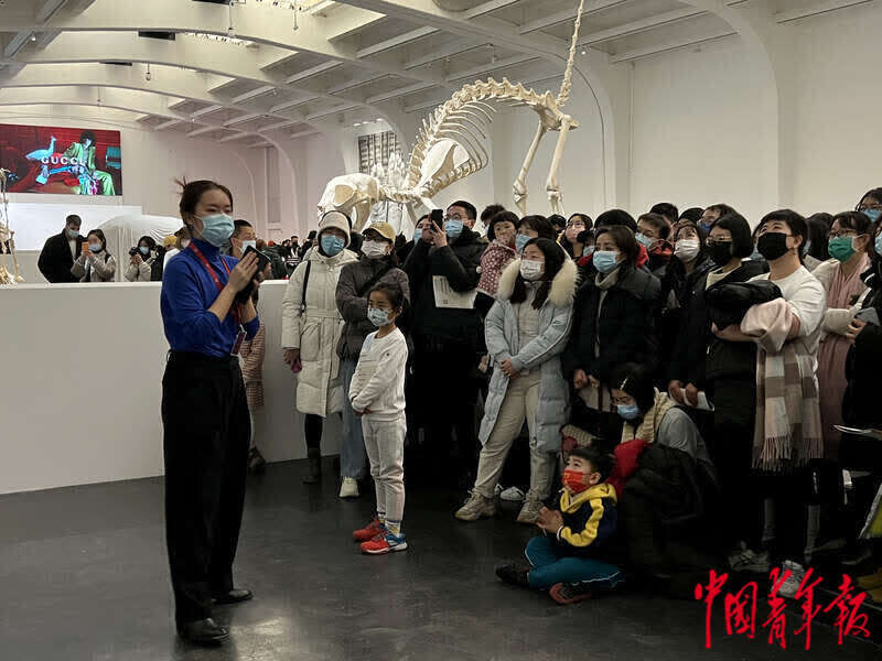 2月5日,北京798艺术区,尤伦斯当代艺术中心,“莫瑞吉奥·卡特兰:最后的审判”展览现场,参观者们在听导览员讲解作品。中青报·中青网记者 程璨/摄