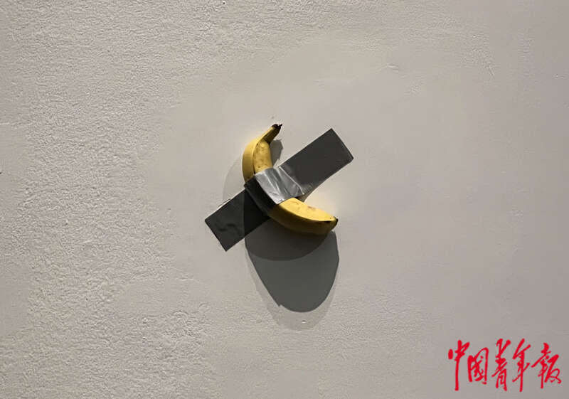 2月5日,北京798艺术区,尤伦斯当代艺术中心,“莫瑞吉奥·卡特兰:最后的审判”展览现场,参观者们在《喜剧演员》作品前。2019年12月,卡特兰在迈阿密海滩巴塞尔艺术展上首次展出了该作品,用胶带将一根香蕉贴在画廊展台的墙上,激发了全球范围内对艺术本质和价值的探讨。中青报·中青网记者 程璨/摄