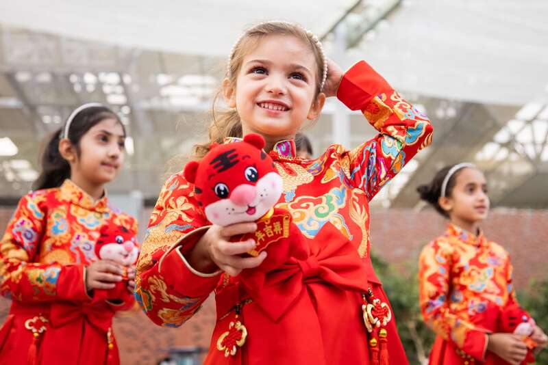 1月31日,当地小朋友们在阿联酋迪拜世博园内给游客拜年。1月31日,由中国国务院新闻办公室、中国国际贸易促进委员会主办的“感知中国——走进迪拜世博会”活动在迪拜世博会中国馆揭幕。“大象旅行团”、“熊猫慢直播”、汉服展演、汉服音乐快闪等活动陆续登场,为迪拜世博会带来浓浓的中国味儿。新华社发(李凯祥摄)