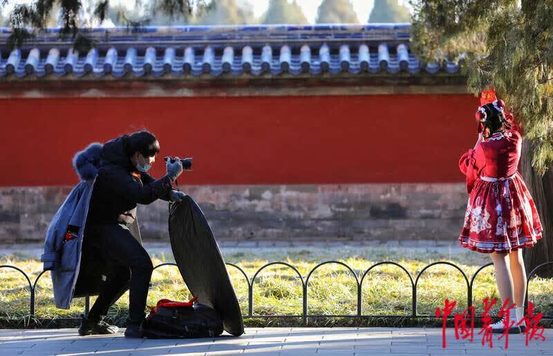 2月3日,大年初三北京天坛公园里的一个年轻摄影师在忙碌着给小伙伴拍摄春节纪念照片。中青报·中青网记者 李建泉/摄