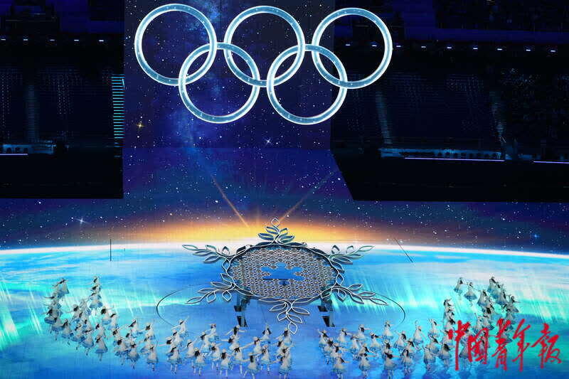 2月4日晚,第二十四届冬季奥林匹克运动会开幕式在北京国家体育场举行。用激光雕刻出的“冰雪五环”璀璨夺目,亮相舞台。中青报·中青网记者 李隽辉/摄