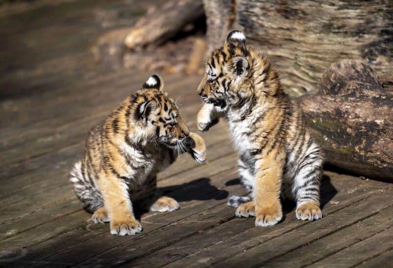 1月30日,云南野生动物园内的两只东北虎幼崽在相互打闹。虎年将至,云南野生动物园内的两只东北虎双胞胎幼崽姐妹受到格外青睐。据介绍,春节期间,两只东北虎幼崽将担任动物园新年巡园官与市民见面。新华社记者 陈欣波 摄