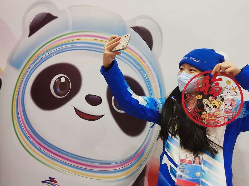 1月31日,志愿者杨艳楠在延庆冬奥村自拍留念。除夕当天,北京冬奥会延庆赛区冬奥村里张灯结彩,志愿者和各代表团成员相聚一堂,庆祝欢乐祥和的春节。延庆冬奥村总面积11.8万平方米,分为居住区、广场区和运行区三个区域,冬奥会期间预计将接待来自90个国家和地区的1200多名运动员和随队官员。新华社发(罗敏利摄)