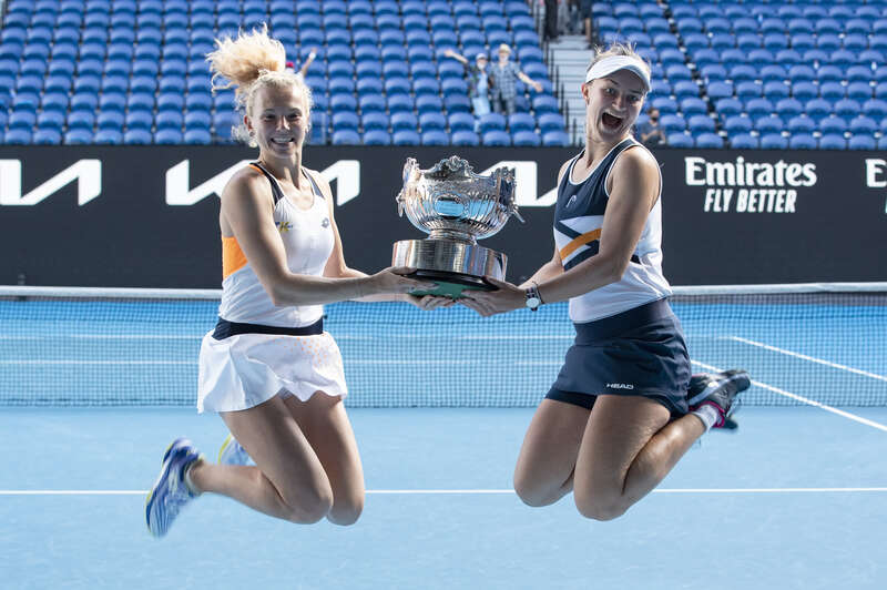 1月30日,捷克组合西尼亚科娃/克赖奇科娃在颁奖仪式上。当日,在墨尔本进行的澳大利亚网球公开赛女双决赛中,捷克组合克赖奇科娃/西尼亚科娃战胜马亚(巴西)/丹妮莉娜(哈萨克斯坦),夺得冠军。新华社记者 白雪飞 摄