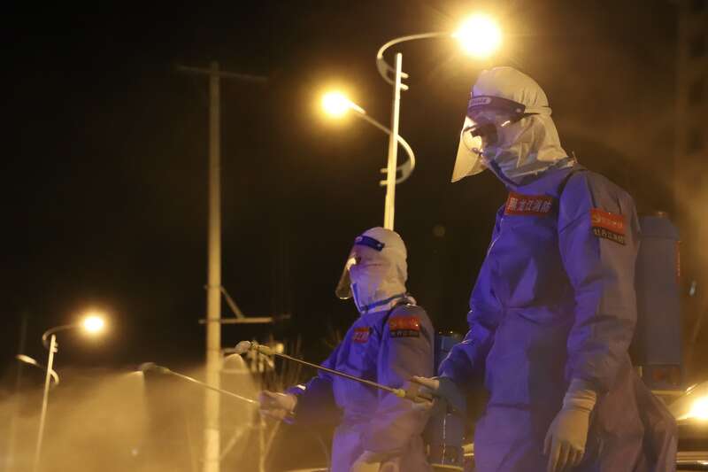 1月31日凌晨,消防员在绥芬河市一小区门前消杀。临近新春,疫情突袭,中俄边城黑龙江省绥芬河市再次面临考验。为快速打赢疫情防控阻击战,民警、消防员、医护人员、志愿者等坚守在一线,市民们顶风冒雪,有序进行核酸检测。这个除夕,边城绥芬河全民携手守护家园、守望新春。新华社记者 徐凯鑫 摄