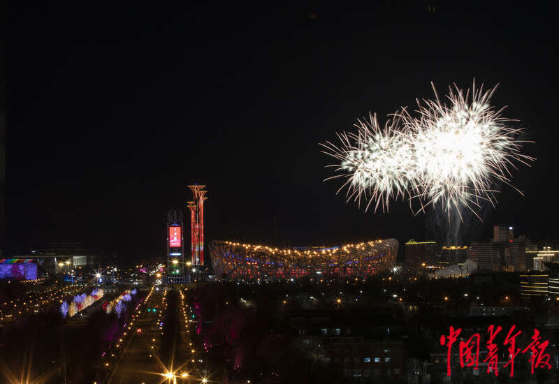 2月4日晚,北京冬奥会开幕式的焰火照亮国家体育场鸟巢上空。中青报·中青网记者 陈剑/摄