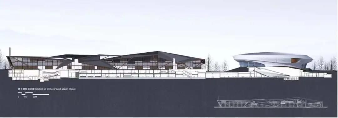 为降低寒冷气候的不利影响,团队规划设计将地下各部分功能联通,打造地下暖街,使人们在寒冷的冬季足不出户就能到达各个区域。现代电车从户外可以直接进入暖街穿行而过,增加冬季城市的空间活力。