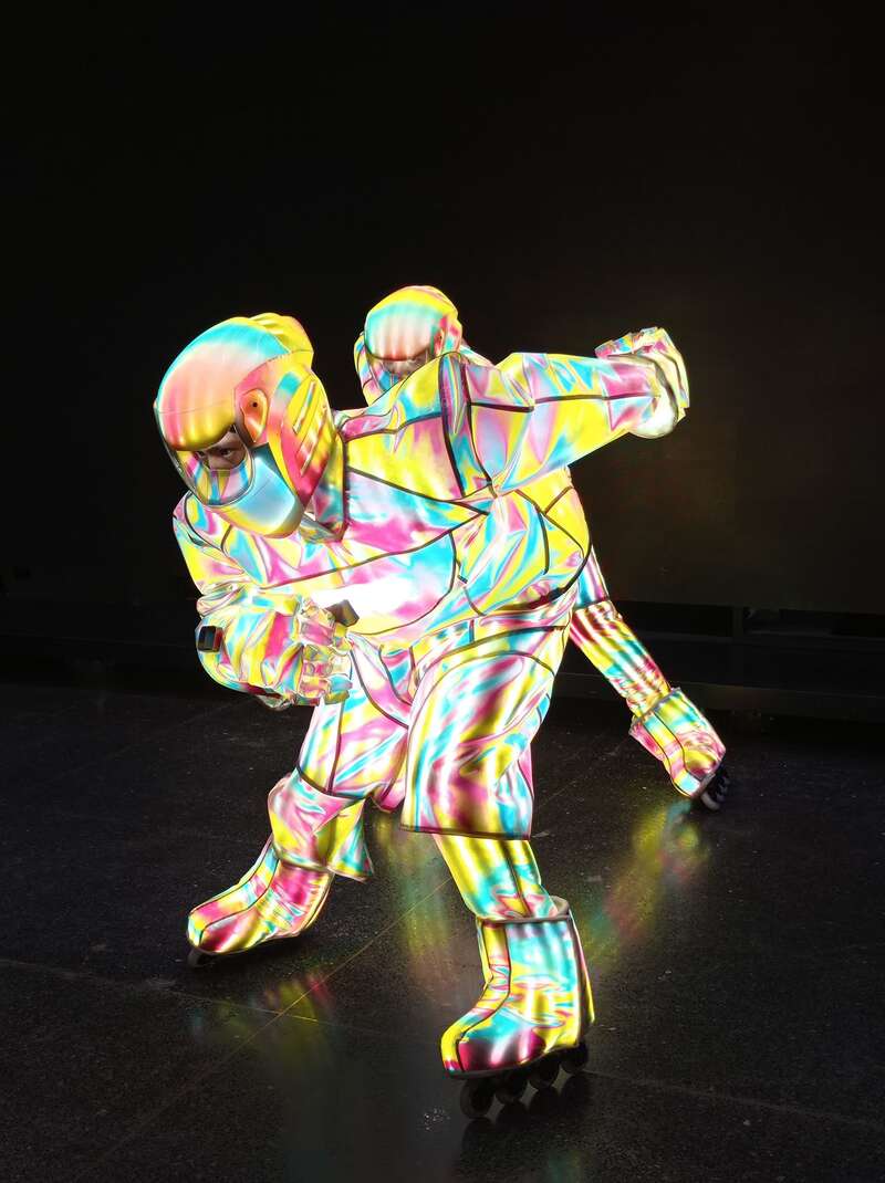 肖遥说,相比两分半钟的轮滑表演,时长30秒的未来冰球队节目难度稍低,对于他这样的专业学生,冰球运动的整套动作能更快上手。去年10月,他们花了一个月时间,提前训练了冰球节目后,就与24名轮滑演员一起准备。