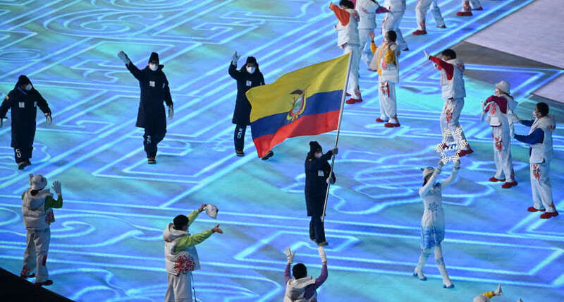 2月4日晚,第二十四届冬季奥林匹克运动会开幕式在北京国家体育场举行。厄瓜多尔代表团旗手、高山滑雪运动员莎拉·埃斯科巴尔(中)是该国史上首位冬奥女选手。新华社记者黄宗治摄