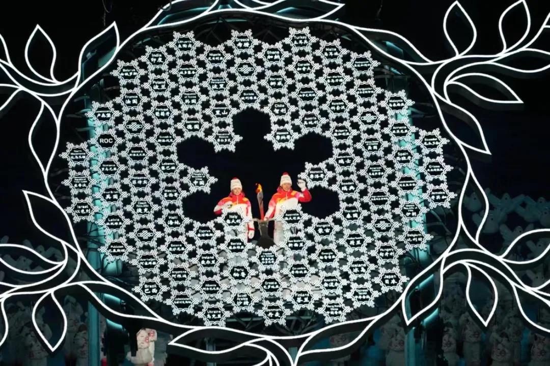 之前,运动员入场后,约91名引导员将写有国家和地区名字的雪花构建成一朵巨大的雪花,外沿是橄榄的枝叶,璀璨发光。它也成为了最终的火炬。