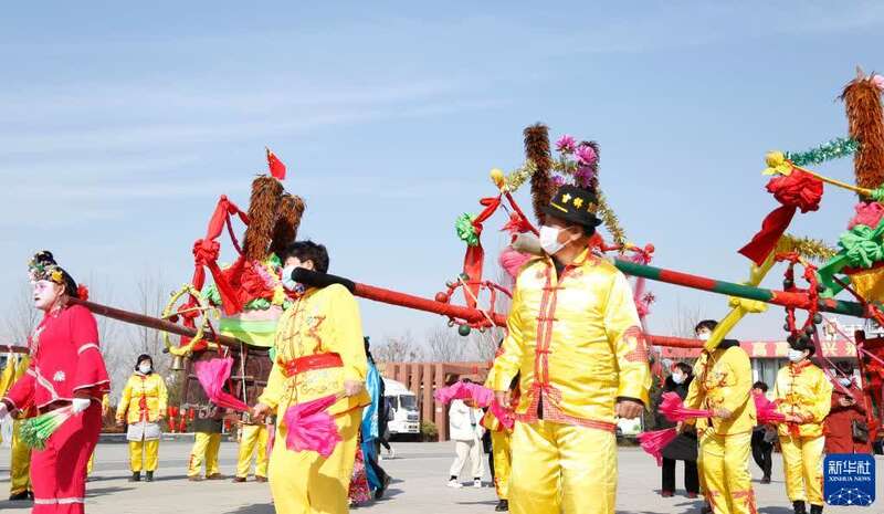 2月5日,在河北省邢台市南和农业嘉年华,民间艺人表演非遗“抬黄杠”。