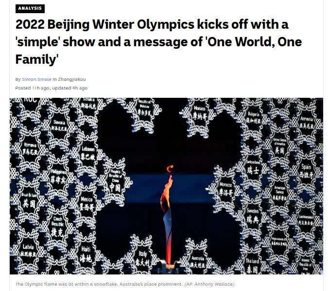 澳大利亚广播公司报道截图 澳大利亚广播公司(ABC)刊文称,受疫情因素等影响, 2022北京冬奥会开幕式持续了仅约两个小时,参与现场表演的约为3000人,而2008年奥运会为15000人。而且,此次参与演出的大多数是普通人,而不是专业演员。5日的开幕式虽与2008年那场惊艳世界的开幕式风格不同,但依然令人回味无穷,令人惊叹的编舞和现场视觉效果尤其令人记忆深刻。但更令人印象深刻的是,此次开幕式将 “世界一家”的思想贯穿始终,促使人们去关注和思考奥运会如何让人们团结在一起,这也正是奥林匹克运动的使命。在新冠疫情依然肆虐、世界分裂和对抗愈演愈烈的当下,这显得更加意义重大。