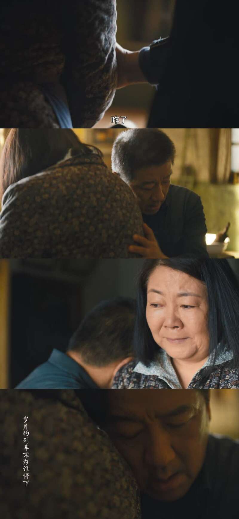 周父抓住她的手臂,轻声问,“咋了”。他绊住她的手臂,轻拍她的背部,头紧紧靠着她。周母的泪水决堤。这时BGM响起“世间的苦啊,爱要离散雨要下”,令人动容。