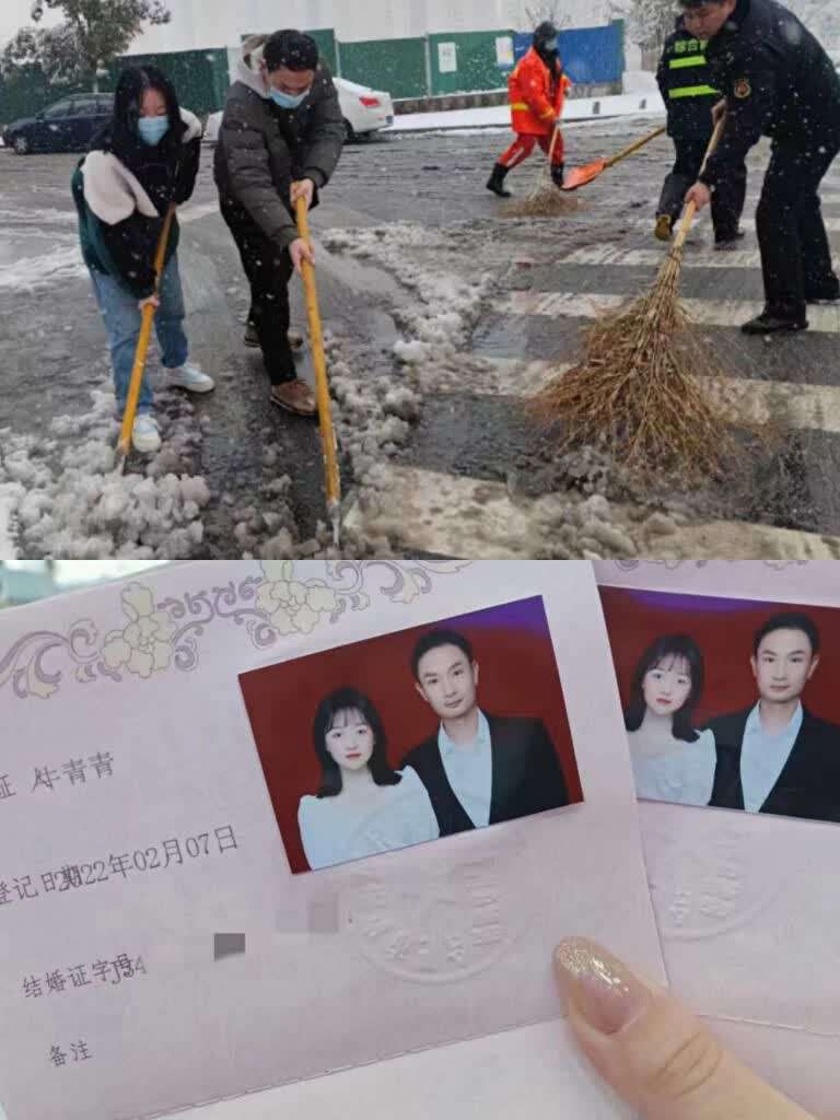 当天上午,合肥市庐阳区四里河街道城管中队组织青年城管、环卫铲雪除冰。正前往庐阳市民中心办理结婚证的窦松磊、牛青青两位青年主动要求加入志愿者队伍,与城管队员们一起拿铁锹铲积雪。