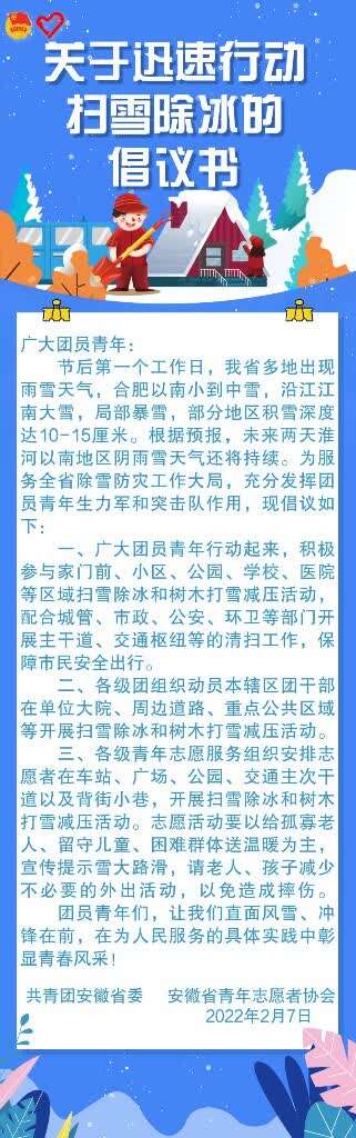 2月7日的合肥,这样的故事还有很多。面对低温和大范围降雪,在团安徽省委和省青年志愿者协会号召下,团合肥市委、合肥市青年志愿者协会第一时间向全市团组织、团员青年、青年志愿服务组织等发出抗击冰雪倡议书。冰天雪地里,一个个红马甲,一面面团旗成为一抹亮色。