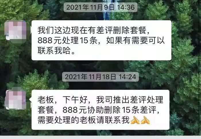 除了可以花钱刷好评,还可以付费删差评。武汉一家餐厅经营者李先生告诉记者,开业不久就有机构找上门来,表示可以帮助删除差评,“订购888元套餐,可以帮助处理15条差评。”