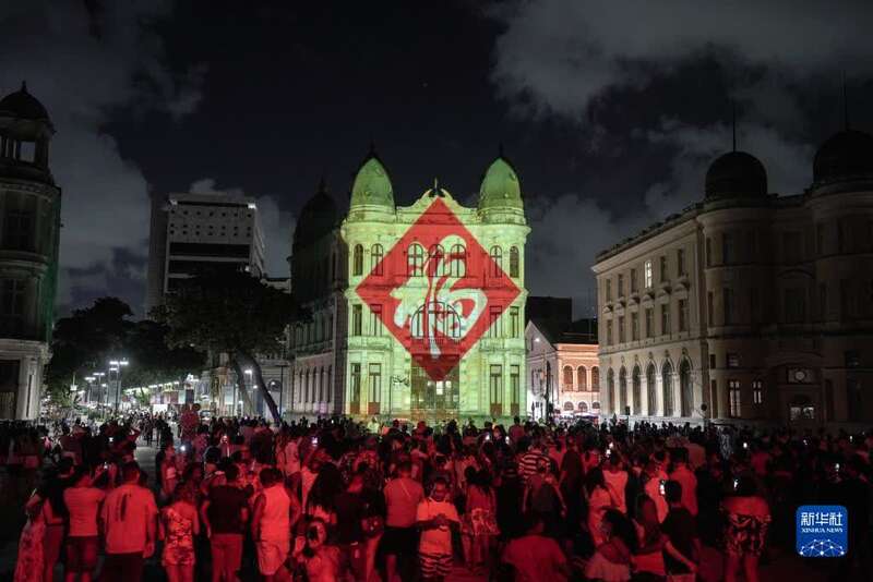 1月30日,人们在巴西累西腓观看“庆新春、迎冬奥”灯光秀。新华社记者 王天聪 摄